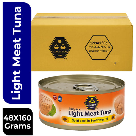 \nStock up with the Al Wazzan Skipjack Light Meat Tuna Value Box, \ncontaining 48 cans (160g each) of premium quality tuna. \nSolid-packed in sunflower oil, this tuna offers a light, fresh taste \nwith the health benefits of Omega-3 fatty acids. \n \nPerfect for families, restaurants, catering services, and bulk buyers, \nthis box delivers unbeatable value and trusted quality. With its \neasy-open lids, preparing meals has never been easier — from fresh salads \nand sandwiches to hearty pasta and rice dishes. \n-