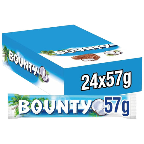 \nIndulge in the tropical taste of Bounty! This box contains 24 individual 57g bars of Bounty Chocolate – a deliciously rich milk chocolate exterior wrapped around a moist and chewy coconut filling. \n-